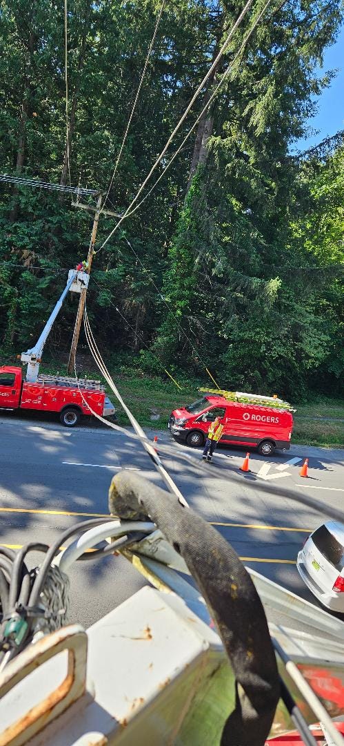 今天总的说还算顺利,但下午在列治文就碰到一个非常麻烦的,这个地方我大概一个月之前去过,当时我是开吊篮车的,这路两边都是条小河,吊篮刚好可以伸到电线杆接线的位置,那天一直在下雨,到的时候也是下午,那屋主是个华人老太太,说已经等了一个月了。我大概看了一下地形就到外面准备,准备好升到电线杆上接上表做测试,信号本身就不是很好,我看那条电缆其实也像是刚刚换过的,正在犹豫间一起的同事说他那边梯子进不去,其实我刚到的时候看过进去是没问题的,但确实两边都很难弄,而且我判断外面的线路没问题,换了也没用,于是就在这张单上留了个记录,让再派人到屋里检查一下就收摊了。